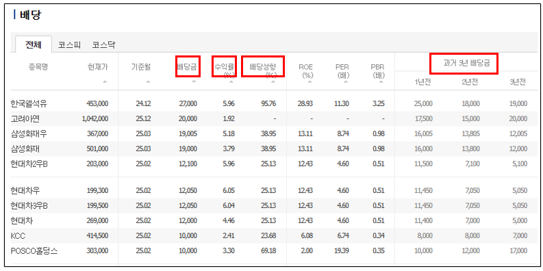 - 네이버 증권에서는 배당금, 수익률, 과거 배당 이력 등을 순위로 확인할 수 있음