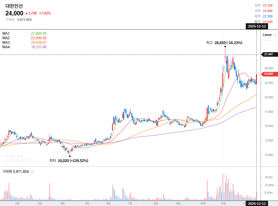 실제로 대한전선의 2025년 주가 흐름은 1월 대비 약 35% 상승 후 조정을 반복 중입니다.